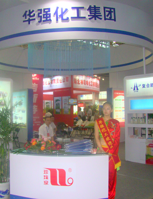 在展位布置上,展會主要采用“華強藍”為主色調(diào)。20多平米的展廳,“華強化工集團”六個藍色的大字格外醒目?!按蛟彀倌昶髽I(yè)”、珍珠泉中國馳名商標等標語被印刻在裝飾臺四面,展位三面放置3臺LED顯示屏,滾動播放公司企業(yè)文化及產(chǎn)品介紹視頻,產(chǎn)品展示柜里陳列著公司復合肥的各個類別產(chǎn)品及產(chǎn)品說明書。