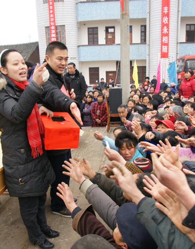 3月6日上午,集團(tuán)公司黨委副書記、工會主席王建波同志代表董事長、總經(jīng)理余華強(qiáng)同志將公司生產(chǎn)的20噸、價值6萬余元的復(fù)合肥送到兩河鎮(zhèn)雙龍村村民的手中。這是我公司今年開展“反哺三農(nóng)、送肥下鄉(xiāng)春風(fēng)行動”的又一新舉措。近2個月來,我公司和當(dāng)陽電視臺壟上行欄目組聯(lián)合在我市各鄉(xiāng)鎮(zhèn)開展20余次送肥下鄉(xiāng)、有獎銷售獲獎客戶聯(lián)誼活動。