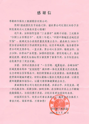 近日,當(dāng)陽(yáng)市人民政府向我公司送來(lái)感謝信。感謝信充分肯定了華強(qiáng)化工集團(tuán)作為全市龍頭骨干企業(yè)一直心系當(dāng)陽(yáng)、植根當(dāng)陽(yáng)、助力當(dāng)陽(yáng),在推動(dòng)產(chǎn)業(yè)轉(zhuǎn)型、加強(qiáng)科技創(chuàng)新、招引高端人才、抗擊新冠疫情、增進(jìn)民生福祉等方面發(fā)揮了重要作用,為當(dāng)陽(yáng)經(jīng)濟(jì)社會(huì)發(fā)展作出了突出貢獻(xiàn),對(duì)華強(qiáng)化工集團(tuán)長(zhǎng)期以來(lái)給予當(dāng)陽(yáng)發(fā)展的關(guān)心支持表示衷心感謝!